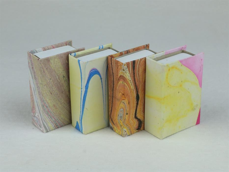 Jedes Stück ist ein Unikat, überzogen mit buntem Marmorpapier.