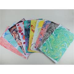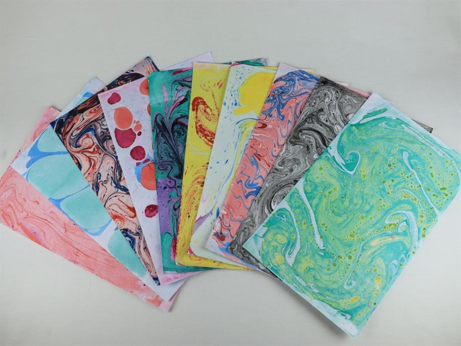 Eine diverese Auswahl von unseren selbsthergestellten Marmorpapieren, für Ihre kreativen Projekte.